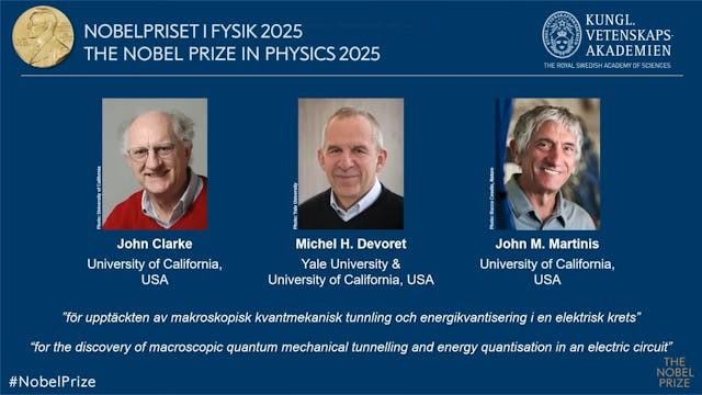 英國學者、美國加州大學柏克萊分校教授克拉克(John Clarke);法國學者、Google Quantum AI量子硬體首席科學家德沃雷(Michel H. Devoret);美國學者、加州大學聖塔芭芭拉分校教授、洛杉磯Qolab公司首席技術長馬丁尼斯(John M. Martinis)獲諾貝爾物理學獎。他們解決了量子力學的一大難題,證明了展示量子力學的穿隧效應(tunnelling),在宏觀尺度上展示的最大模規。