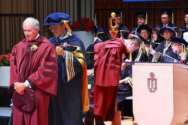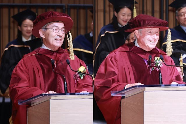 科大校董會主席沈向洋表揚各位榮譽博士都是開創先河的典範,其成就啟發了全球對卓越的追求,續指他們憑藉遠見卓識與堅定不移的決心,開闢新徑,在各自領域屢屢突破,作為模範生,他們「足令科大師生見賢思齊,勇於挑戰現狀、擁抱創新,以知識驅動社會前進,共塑未來。」