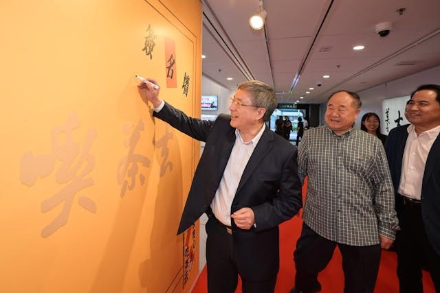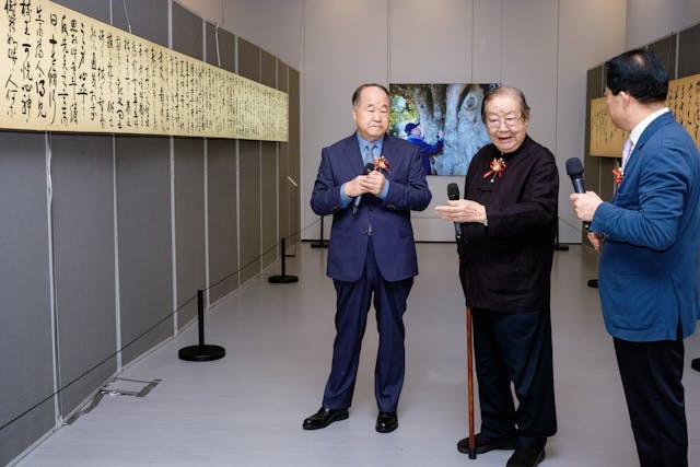 諾貝爾文學獎得主莫言與書法家王振以「文墨共生」為核心主題,攜手呈現「放寬心吃茶去」書法攝影展,展現兩人同名隨筆集《放寬心,吃茶去》中「以腳步丈量山河,以筆墨書寫心境」的旅行創作歷程,既延續「茶碗一傾,天地廣闊」的生命熱忱與豁達心境,也為香港文化藝術領域注入了新的活力。