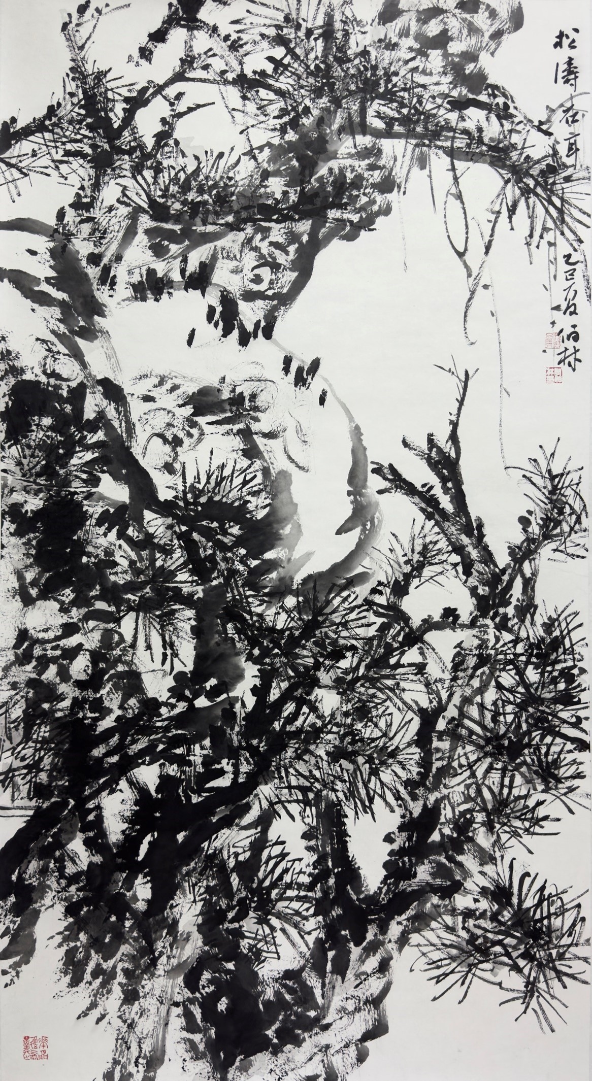 筆者在他的《松濤在耳》大作前嘆為觀止:款式主題鮮明,布局滿而有條不紊。純墨色的層次掌控,松針在主幹枝條上,靈動飄拂若聞風起舞,耳際如有松濤之聲。周伯林充滿情感想像的認知,傳達出他內心的憧憬。古人常形容松針凌空劈發之聲,氣勢磅礡的松濤,意境悠揚而壯闊。畫雖無聲勝有聲,南宋有畫家馬麟全景色的《靜聽松風》,當今畫家周伯林卻採取更為簡潔特寫鏡頭。從古至今畫中所描寫的松風或松濤聲,莫不是靜聽自己內心的聲音?中國畫借大自然的生機,令觀賞者恍如亦聽到這松濤的聲,這便是中國文化的內涵:超脫塵世的心靈感應。