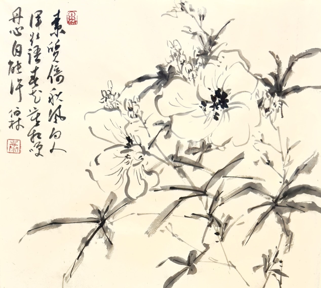 筆者還喜歡他特別素雅的《秋葵》。周伯林借明代畫家陳淳的詩句:「素質倚秋風,向人渾欲語。春風莫相笑,丹心自能許。」擬人化的秋葵,秋風搖動她婀娜的身姿,潔淨不與俗同的心志,彷彿想向人傾訴:季節的輪轉,新陳代謝是自然規律,不必相互取笑。淋漓疏爽的筆意,含有赤誠的忠貞,不同凡卉的高尚潔淨。圓潤清媚的《秋葵》,如蟹爪的綠葉,更超越了陳淳的玄門。