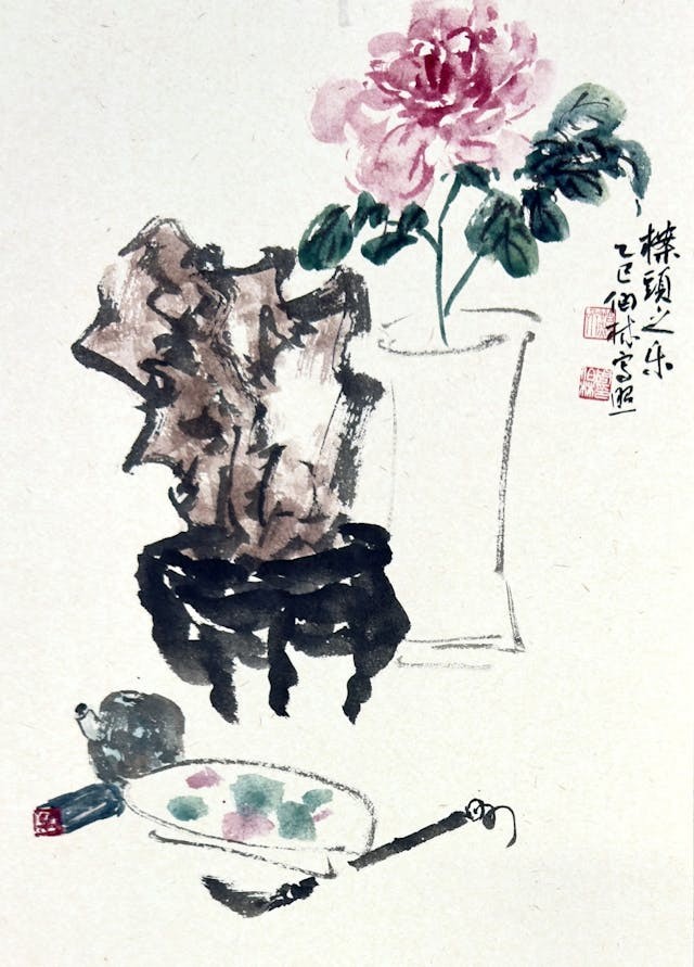 再例舉周伯林另一幅《案頭之樂》。歷代文人雅士,素來講究的書桌的擺設,象徵着他們的精神情懷。中國傳統繪畫中,描繪案頭的靜物,稱謂「清供圖」或「歲朝清供圖」,歷來層出不窮。眼前視線範圍的《案頭之樂》,潦潦數筆如數家珍,敘述明晰熟練,白色花樽內插上優雅的芍藥;烏檀木托架上玲瓏的太湖石。紫砂茶壺、一方印章、調色盤、一枝優質毛筆,沉穩內斂的揮毫,案頭排列的層次、質感、色澤,分明又融和,意存筆先,畫盡意在,逸筆草草,抒發出他日常陶醉的頤養氣息,靜靜穿連在一以貫之的文脈時空。