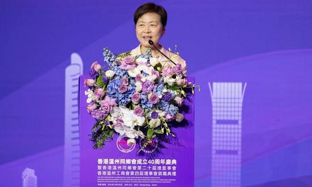 香港前特首林鄭月娥出席晚宴,稱讚溫州人用自身奮鬥將中華優秀文化和「溫州人精神」帶向全球。她表示,香港溫州同鄉會代表的同鄉社團,是維護香港繁榮穩定、落實「愛國者治港」的重要基礎力量;她希望會方及在港溫州人發揮優勢,積極參政議政,當好連接香港和內地聯動發展的橋樑,為香港更好融入國家發展大局作出更大貢獻。