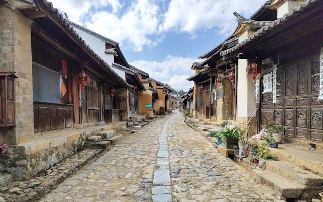 穿過古門樓,彷彿步入時光隧道:秋日的太陽照在一條石塊鋪就、通向遠方的古道,依稀可見昔日留下的馬蹄印。古道旁有一座大宅「李家大院」,雖然滄桑殘舊但氣勢猶存,門口貼有對聯,燈籠高掛,顯示大宅裏有人居住。