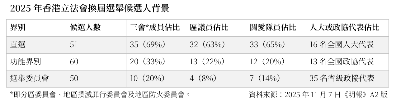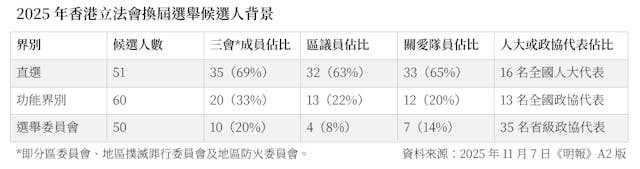 初步統計,51名候選人中有16名是港區全國人大代表。在競逐功能界別的候選人中,約五分之一是政協委員,三分之一來自三會成員,近五分之一是區議會議員及關愛隊成員。