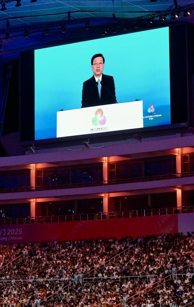 擔任十五運會組委會執行主任的香港行政長官李家超在開幕式上致辭,他表示這是香港回歸祖國以來,首次以承辦城市身分參與全運會,感謝中央的信任,本屆首次由粵港澳三地共同承辦,充分體現國家對大灣區協同發展的堅定支持,更是香港融入國家發展大局的體現,意義重大、影響深遠。