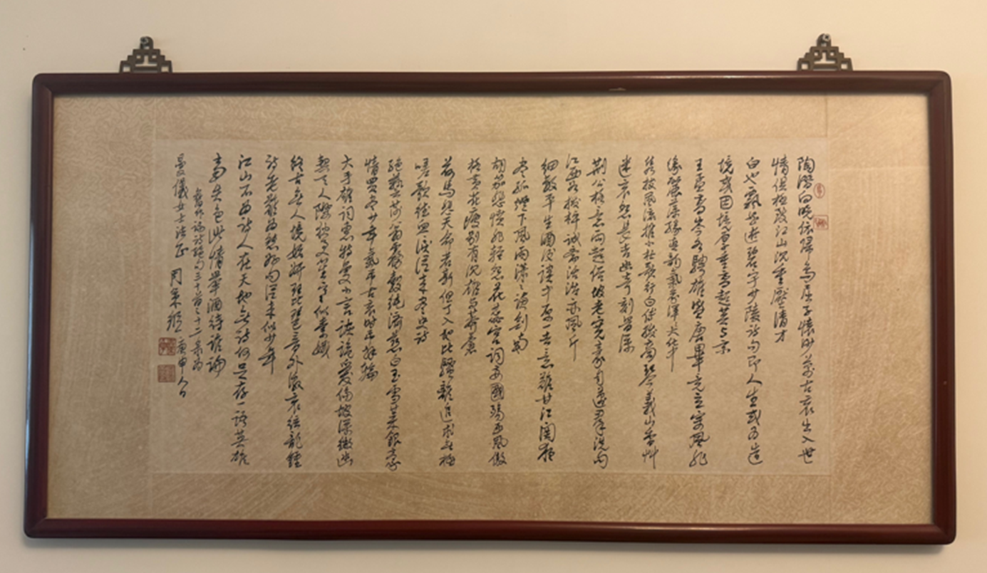 問:方才一進門,就留意到了餐桌旁這兩幅周策縱教授的題字,猜想其中也許藏有一段深厚的情誼,能請你分享這份禮物背後的故事嗎?