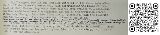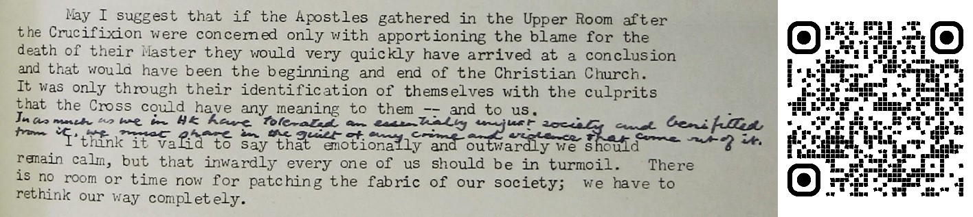 至於靈性層面,則涉及更深層次的問題。1967左派暴動,社會歸咎內地文革和本地左派,不無道理,膚淺以為抓幾個暴徒就能解決問題。Lowcock卻看得更深遠:當年他發表校長報告,在慶辛「暴亂」平息、學校安穩度過之餘,出乎人料臨時發揮,加插一句,做出如下宣示: