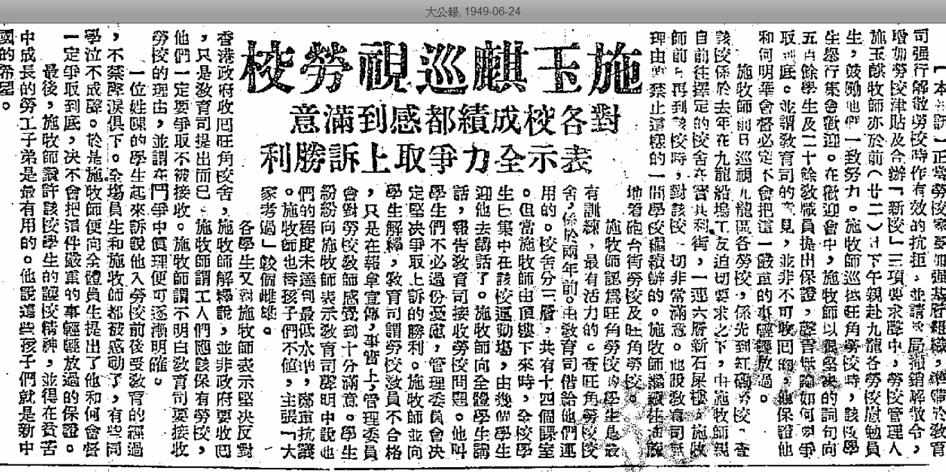 歷史層面更蹊蹺。勞校的辦學團體──港九勞工子弟教育促進會,是中國共產黨香港市委1946年9月成立的外圍非牟利機構。但其主要推動者原來是聖公會何明華會督;第一間勞校更是由教會日校管理人,日後拔萃校長施玉麒籌辦,還任校長。