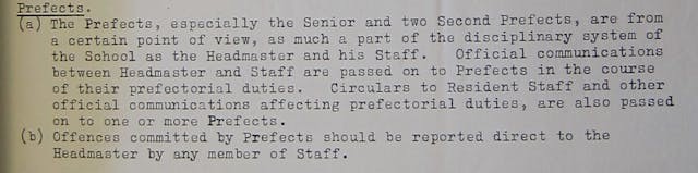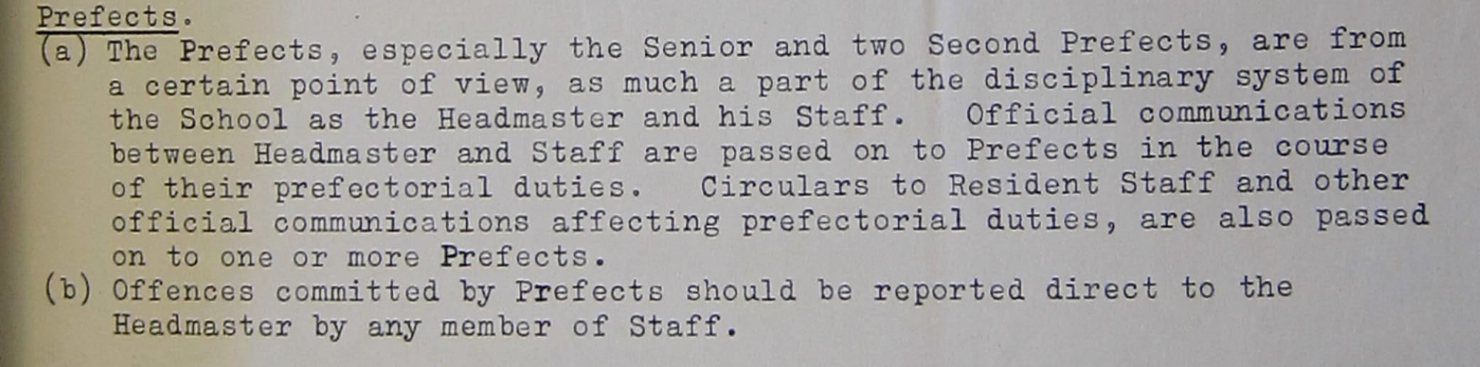 Prefects制度,拔萃是1916年開始的(以前叫monitor),既是校方權力下放的機制,又是學生學習管治的機會。1960年,施玉麒校長向辦學團體匯報學校紀律制度時,作出如下表述: