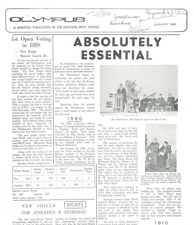 先是上一屆的Senior Prefect為了慶祝校慶,組班底自行設計了新的校徽和第一面校旗,居然被校委會採納。新的設計有三個樣式,大小顏色不同,《聖經》由橫寫變直寫,難以取捨選定。我遂提出另類遴選機制,也被校委會接納,建議採取全校公投,由教職工和學生平等一人一票普選選出,是拔萃第一次,同時還公投決定中午休息時間的長短(當然愈短愈好,可早放學去玩),皆大歡喜,是公民社會的萌芽。
