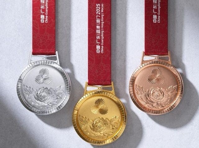 競體項目及群體項目獎牌設計靈感均源自全運會官方會徽,並以三組遞進式層次立體結構呈現,突顯三地禮花元素、交融互通、活力無限。獎牌外邊的三組水圓以莫比烏斯形環呈現,代表生生不息的連接與無限可能,邊緣66道紋路向全運會66年歷史致敬。兩款獎牌環狀浪濤展現珠江、香江及濠江三江匯合。獎牌掛環「同心結」靈感來自港珠澳大橋,體現大灣區的創意與文化共融。