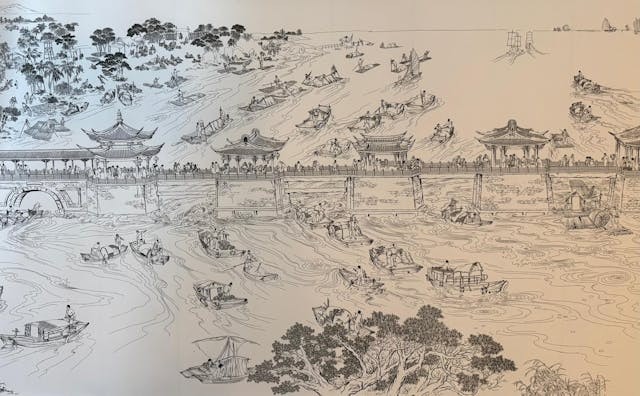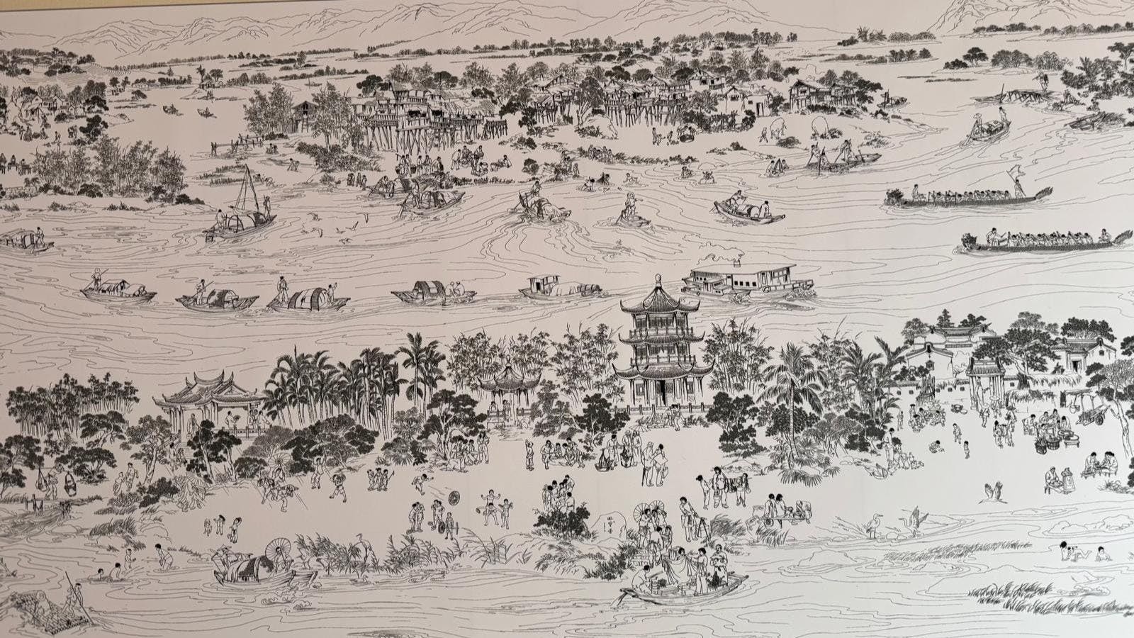 先說一組數字:長卷中有男女老少上萬人、花木近萬株、各種民俗場景近千個、建築物1000多座、各類船隻400多艘。這些人物和場景放在韓江兩岸、鳳凰山下、古城內外的地理環境下,構成一幅民初至上世紀50年代近半個世紀的潮州民俗文化全景圖,氣勢恢宏的構圖、多姿多彩的場面和栩栩如生的各色人物,仿若是一幅現代潮汕版「清明上河圖」。