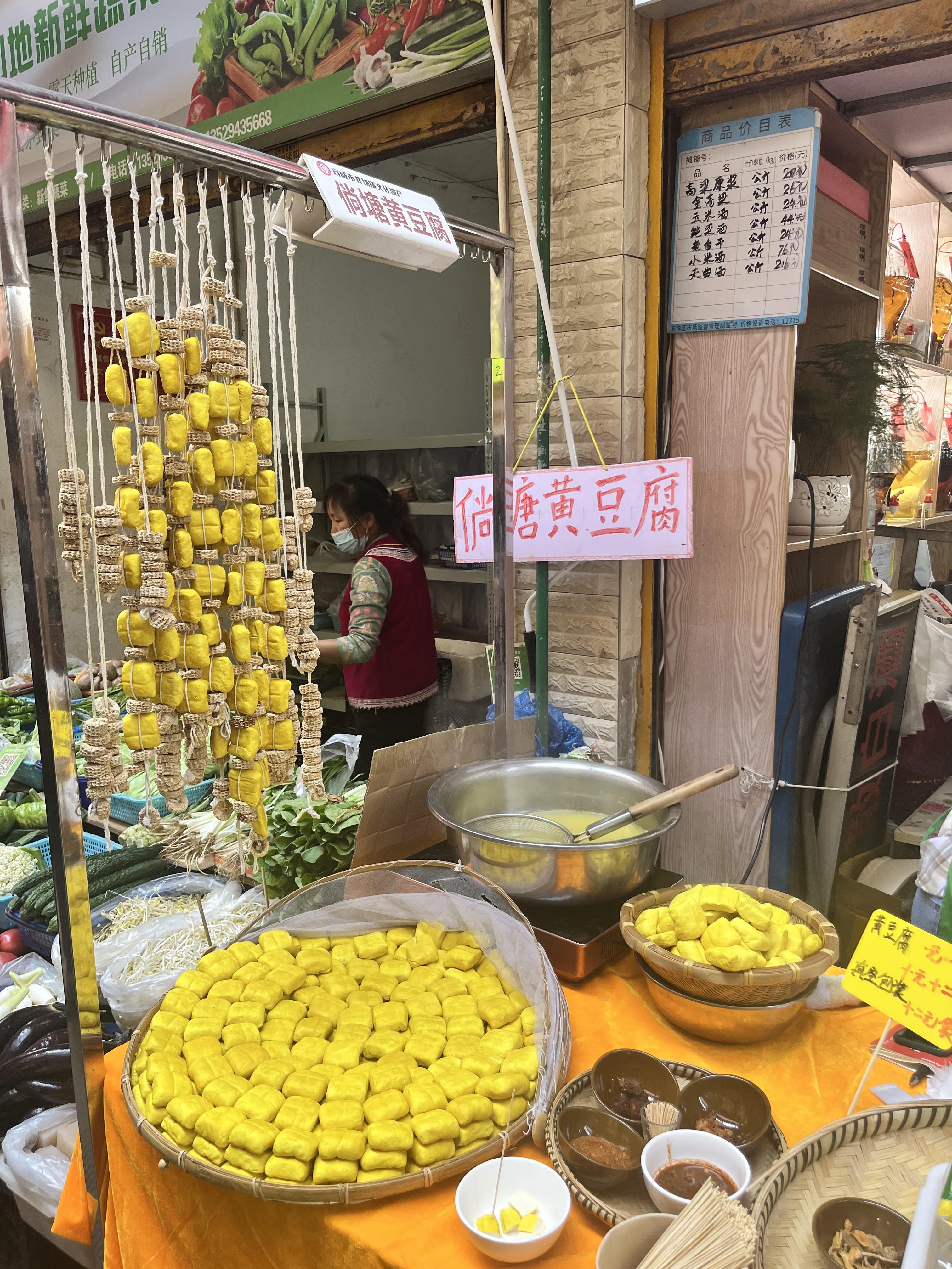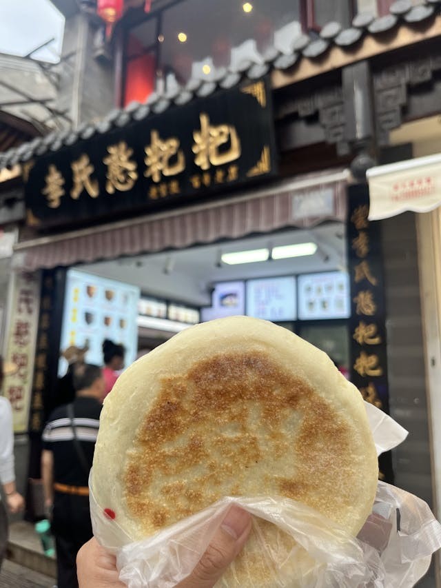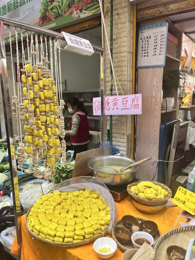 穿行至鼎鼎大名的篆新農貿市場,瞬間被洶湧的人潮和濃烈的生活氣息包裹。摩肩接踵間,一抹明亮的薑黃色跳入眼簾──那是堆叠如小山的倘塘黃豆腐,獨特的色澤源自當地薑黃水的浸染。空氣中交織着各種味道,花椒雞的麻香還有甜白酒的清甜,兩元一個的鮮肉破酥包竟有巴掌大小!層層起酥的外皮,包裹着飽滿多汁的肉餡,一口咬下,麵皮的酥香與肉汁的鮮美在口中炸開,是樸實無華卻直抵人心的滿足。