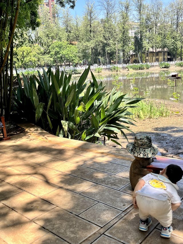 翌日,信步走入翠湖公園。三角梅開得恣意潑辣,一簇簇火焰般的紅,與池塘裏的綠荷相映成趣。點綴其間的是憨態可掬的動物造型石椅,為這片綠意增添幾分童趣。竹林深處,一位老者倚坐石櫈,手握長長的煙斗,悠然吞吐。煙圈裊裊,在斑駁的竹影間緩緩升騰、消散。我的目光被那古樸的煙具吸引,不自覺地凝視,直到突然意識到這般注視甚為無禮,才慌忙移開視線。老人卻並不介意,對我微微一笑。