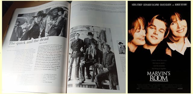 《一切從心開始》(Marvin's Room, 1996)海報展示兩大影后與狄卡比奧平起平坐,他還在中央。影片圍繞自小已生嫌隙的姊妹,戴安基頓所飾女兒患絕症,冀求得近親骨髓續命,迫得向早離家外闖的梅麗史翠普求助。梅麗帶同反叛兒子狄卡比奧回來,此子討厭任性母親,對初遇的獨身姑姑倒生好感,並揭開姊妹積怨。梅麗對當天扔下家中長者給戴安照顧感歉意,她領對方進「馬雲的房間」,看她以三稜鏡折射日光到天花板逗樂已癱瘓的老父馬雲。戴安沒記恨,反感恩有機會付出愛心、照顧長者。尋常倫理片,此情節觸動我心,牢記至今。影片改編自舞台劇,本地劇團也曾搬演。
