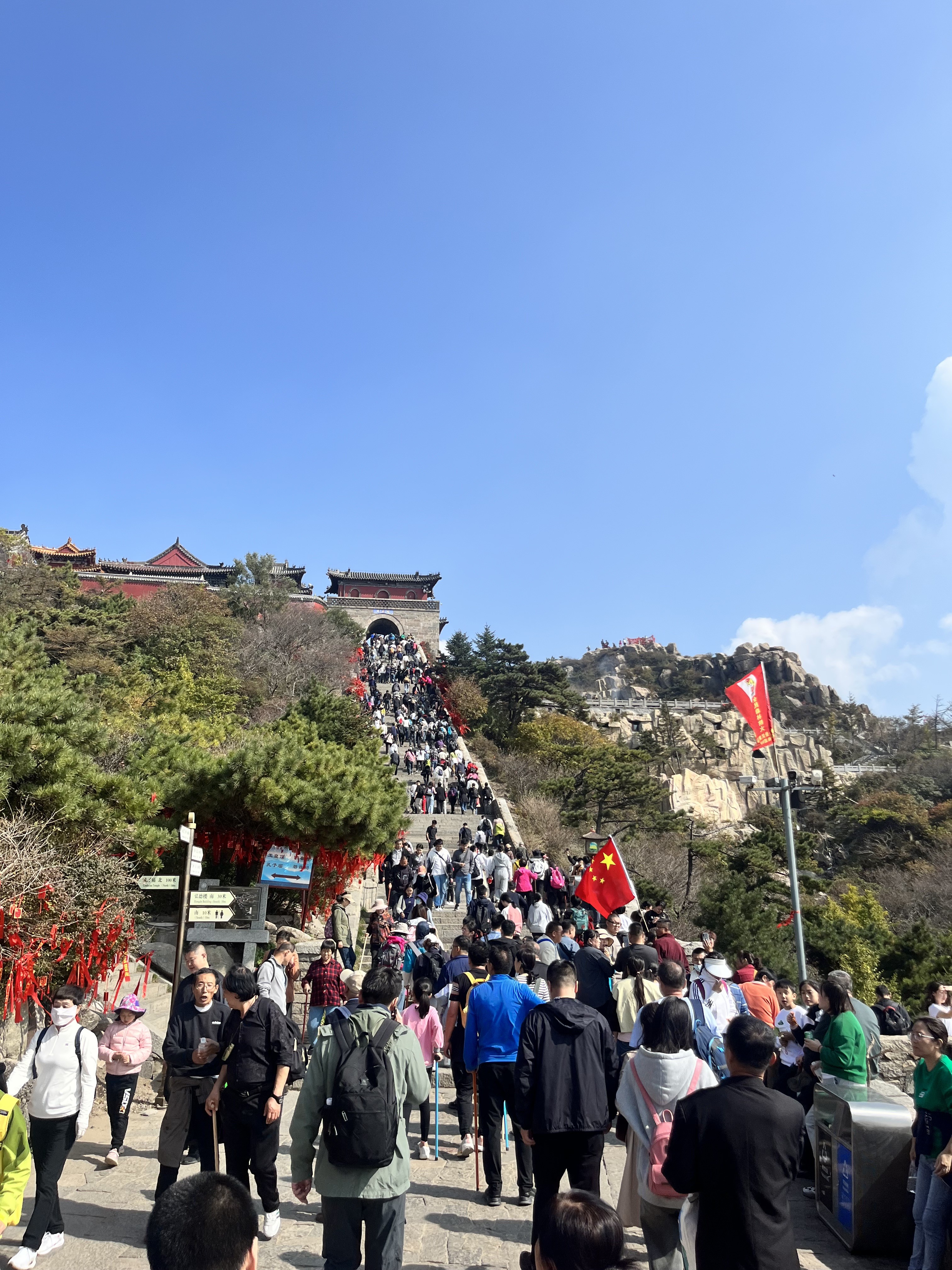 第二天早上,我刻意避開人潮較多的中天門,轉而從西麓桃花峪進山。這是一條清幽之路,10月深秋為層層峰巒披上紅裳。途經元君廟,裏面供奉着泰山女神碧霞元君,小溪流水涓涓。