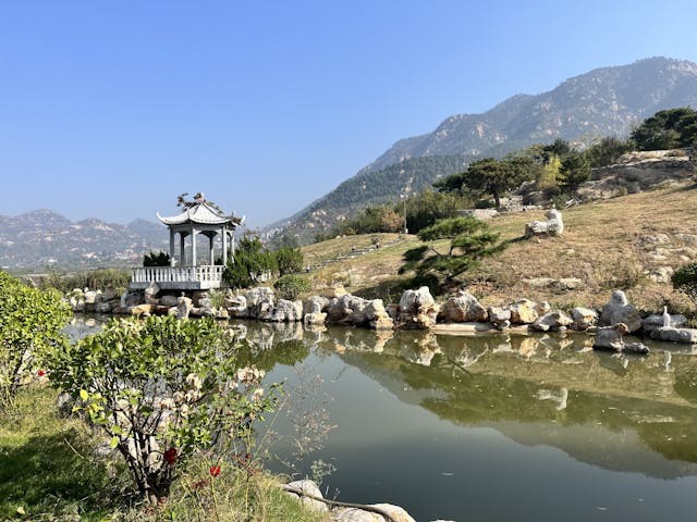 下山後,我入住桃花峪旁的一家山居酒店,這裏遠離喧囂,推窗即見山,正是我所需要的寧靜。酒店外有片約十畝的園林,秋色浸染,亭台錯落,魚池裏居然還有一朵逕自獨秀的睡蓮。我獨坐石亭,聽遠處阿姨在淋花灑水的聲音,混着零星人語與鳥鳴,陽光從松樹篩下金斑,暖意洋洋,腳邊散落幾個巴掌大的松果,張眼是連綿山脈,閉眼則聞秋風送來的淡淡泥土草木香。