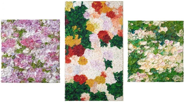 雖然不見具像的花瓣葉片輪廓,但同樣可感悟鮮花之嬌美,舉目滿壁一幅幅大作,恍若置身在濃艷或淡雅的花叢中,由視覺誘發嗅覺,竟然聞到陣陣清香。從藝者、賞畫人、收藏家,蜂擁而至品味或採集,春夏秋冬的季節交替,畫家筆下處處有清甜的花蜜。