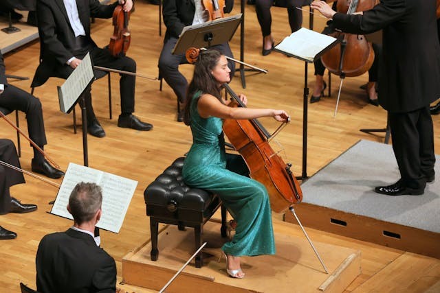 下半場的德伏扎克《大提琴協奏曲》,擔任獨奏的是德國年青大提琴家葛羅美斯(Raphaela Gromes)。對於這首大提琴獨奏經常非常容易被樂團聲浪而顯得渺小的樂曲,葛羅美斯似乎已經用盡了最大的力量與氣場,音量雖不算最強,但飽滿而豪邁的琴音,正好就是演繹德伏扎克樂曲的必然條件。