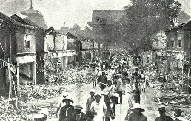 重災區除了覆蓋東京、神奈川和千葉外,靜岡縣和山梨縣內多地亦被波及,整個關東地區都受到災害鏈的牽連與破壞。當年建築物大規模倒塌,大約有29萬棟房屋全毀。因為地震發生時,正值午餐時間,爐火引燃木質建築,火勢形成「火災旋風」,吞噬整片的街區。