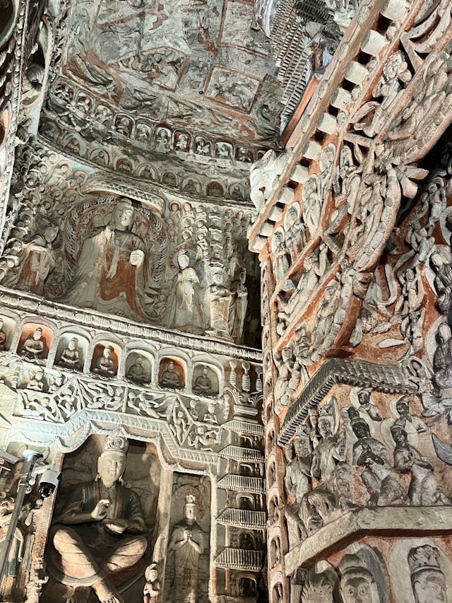 踏上石階,第一眼看到的是長達一公里的崖面,被一個個洞口鑿得像蜂巢。走近了,佛像的面容、飛天的衣帶、藻井的紋樣一層層浮現出來:有的佛低眉含笑,慈和恬靜;有的身形健碩,肩膀寬得幾乎撐滿整個洞口;有的風姿綽約,或拈花微笑,或閉目傾聽;還有的細小如手指節,密密匝匝刻滿整面石壁,對於密集恐懼的我,不敢多看。走到第五、六窟時,視線幾乎無處可落。洞室四壁與中央石柱滿是浮雕,從佛主誕生、成長、婚姻,到出家、成道、弘法,這些故事圖雕其實就是一長篇連環畫。