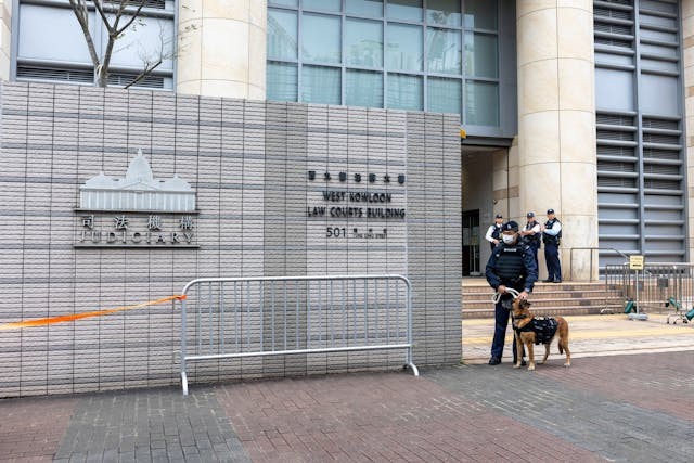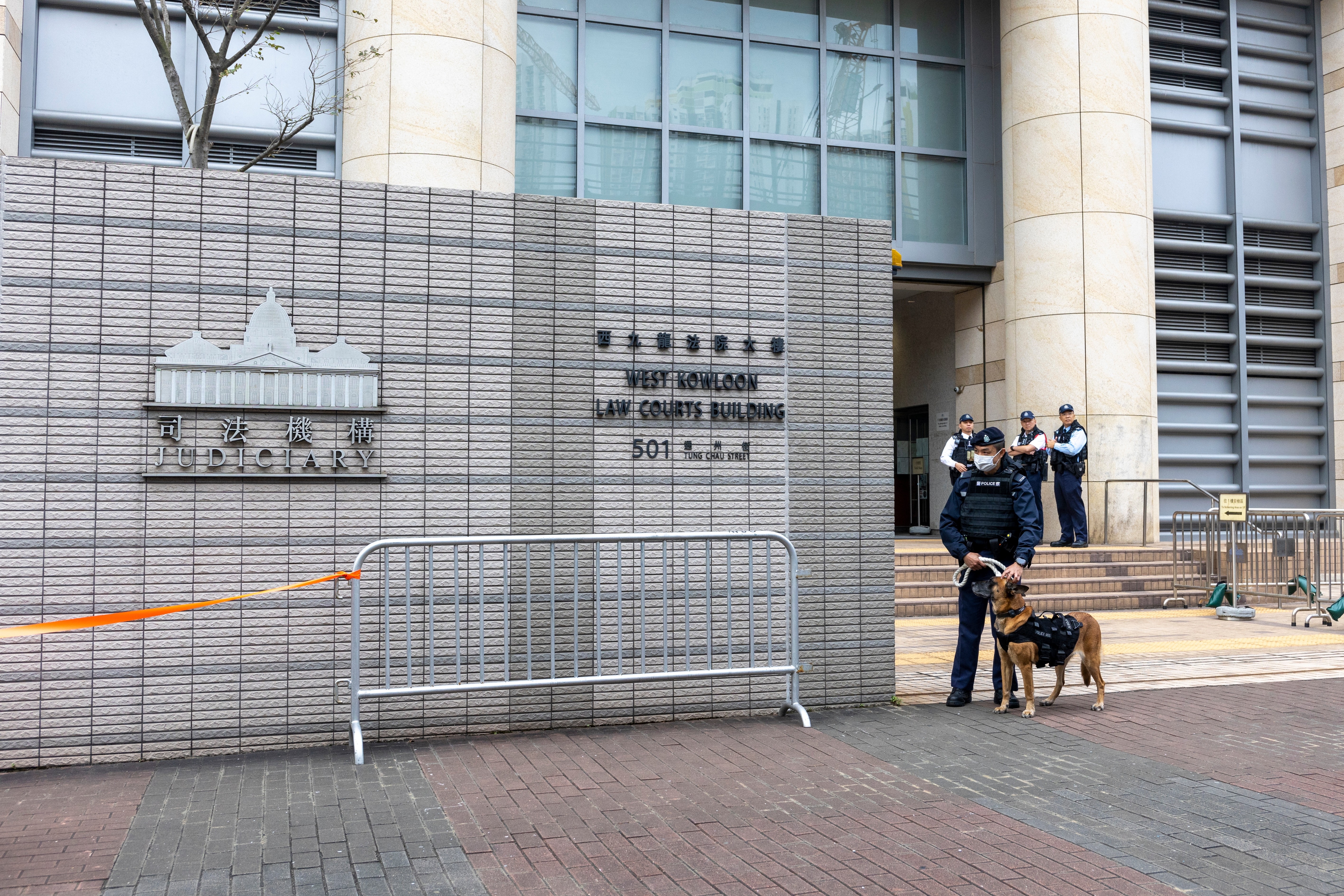 這宗高等法院案件移師西九龍裁判法院審理,早上法院大樓外保安明顯加強,停泊多輛警車及裝甲車「劍齒虎」,大批警員在附近戒備,亦出動警犬巡邏,截查駛經法院的車輛。有市民排隊輪候旁聽,司法機構將安排正庭及延伸庭合共507個公眾席,以及116個記者席。