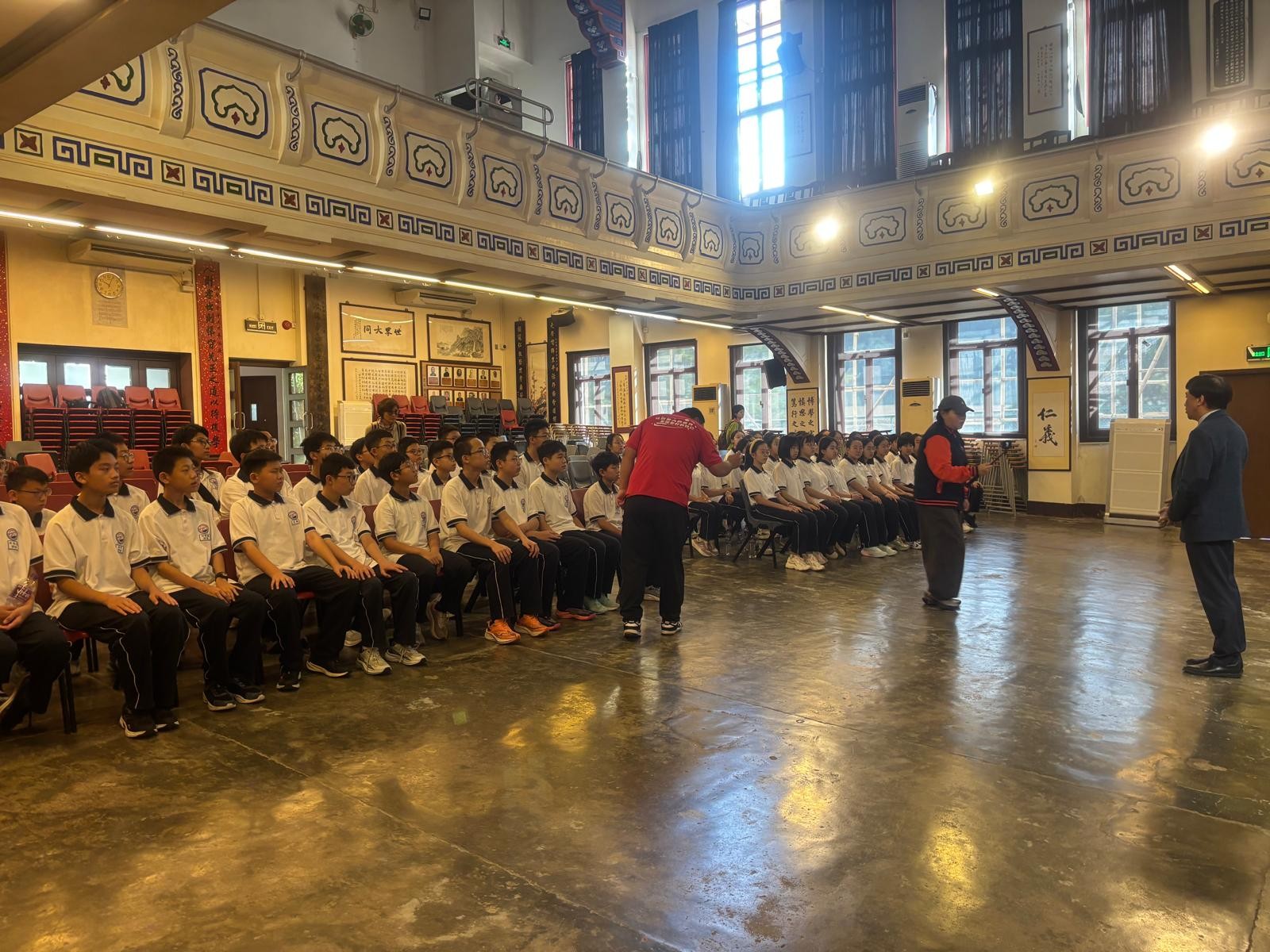 之後,陳主任帶領眾人到禮堂即歷史悠久的孔聖堂安頓。在禮堂,楊永漢校長致歡迎詞後,雙方先互相介紹自己的學校概況,讓大家初步了解,並交換禮物以表達心意。