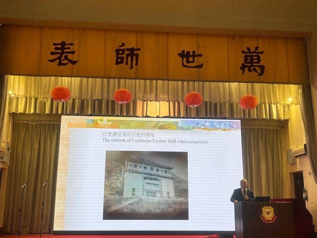 儀式完畢之後,陳主任便開始介紹學校的環境,當然,學校最為人津津樂道的地方一定是禮堂。孔聖堂是香港的文化地標,至今已有90年的歷史,因建築物有定期維修,所以保養得宜。這禮堂的特色不只在它的設計和建造方面,更在其文化地位。過去曾在孔聖堂演講的文化名人不計其數,如許地山、蕭紅、錢穆、唐君毅、杜維明等;而文學巨匠魯迅的追思會也在孔聖堂擧行,當日更有近千人參與。因此,孔聖堂確是一個非凡的地方。