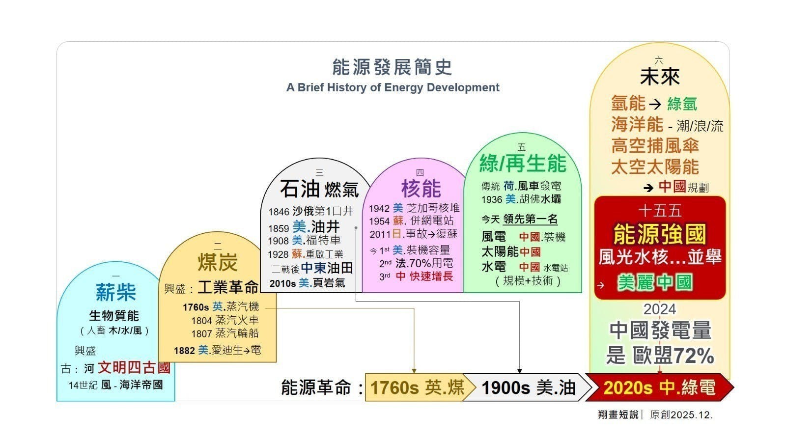 中國以五年規劃為引領,構建完整的戰爭物資保障體系:糧食自給率穩定在90%以上,國防現代化持續推進,基建與運輸網絡高效完備。面對能源結構中「富煤、缺油、少氣」的現實,中國積極推進多元布局:西北發展風光氫儲一體化,西南建設大型水電站⋯⋯清潔電力正成為中國能源安全的新支柱,更被喻為第三次能源革命的「綠電」代表國家。