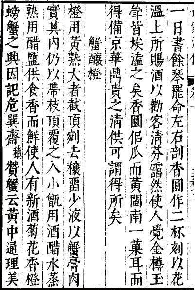 南宋文人林洪所撰寫的養生食療名著《山家清供》中,記載了「蟹釀橙」的做法:「橙大者,截頂,剜去穰,留少液,以蟹膏肉實其內。仍以枝頂覆之,入小甑,用酒、醋、水蒸熟。加苦酒入鹽供,既香而鮮。使人有新酒、菊花、香橙、螃蟹之興……」自2016年杭州G20國宴之後,更多人認識了這道宋代名菜,成了不少高級中餐廳的菜式。