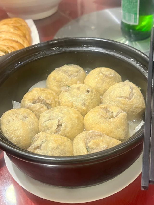這裏介紹釀油燒豆腐:相比慣常吃得的客家釀豆腐,這釀油燒的看似簡單,卻是花工夫的家鄉菜。主食材是芋頭茸與白蘿蔔茸,配料是炒熟糯米飯與臘肉碎、伴蝦米、香菇碎等一併炒製,調味後加葱花,釀入油豆腐內再蒸半小時才完成。食味香口軟糯飽滿,是南雄地方居民過年時節的家常必備。這製作跟我們慣吃的蘿蔔糕、芋頭糕有類同,就如混合蘿蔔糕、芋頭糕的餡料,釀入豆腐卜內蒸煮;稍有不同是不用粘米粉,代以炒製的糯米飯。