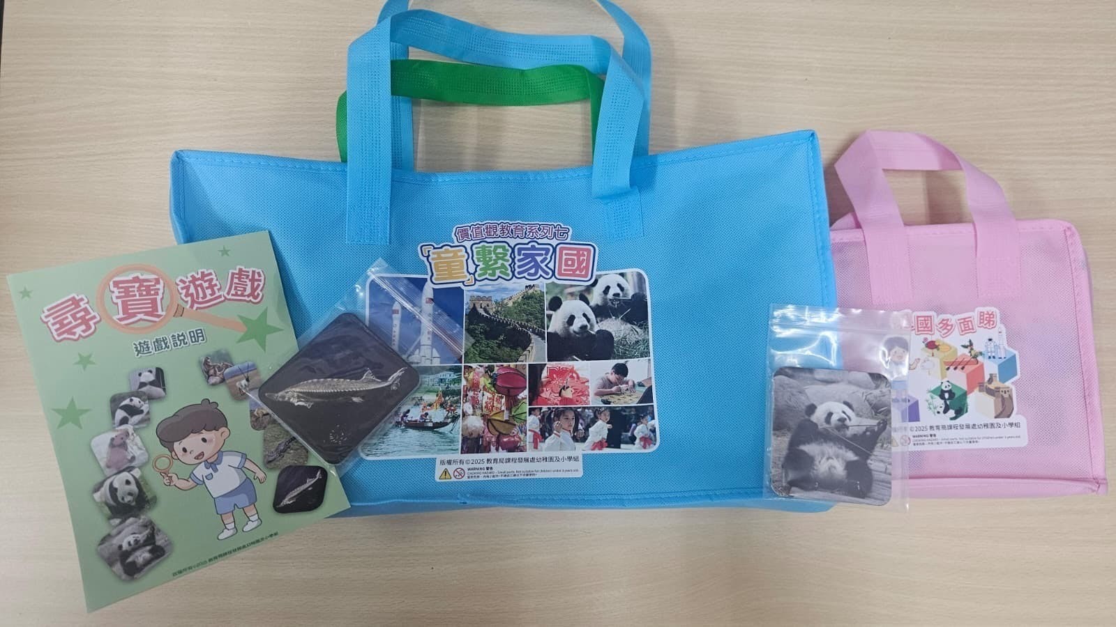 《「童」繫家國》系列教材豐富多樣,包括「國寶大熊貓」故事簡報和有聲故事,以及一套兩款的桌上遊戲。國寶大熊貓故事講述兩名小孩隨家人到香港海洋公園遊覽,認識到大熊貓是祖國送給香港的珍貴禮物。兩款桌上遊戲除了展示不同的大熊貓照片和遊戲方式外,亦讓幼兒從遊戲中認識國旗及國徽、國家的傳統節日和航天科技等,寓學習於遊戲。