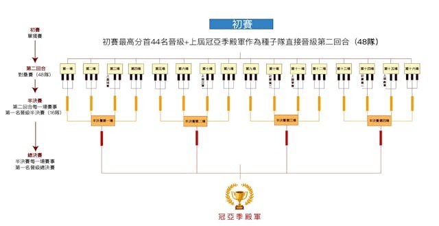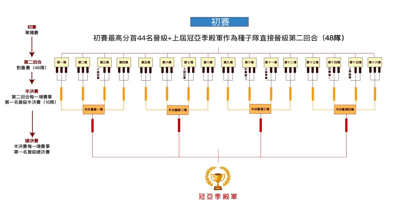 上一屆的冠、亞、季、殿軍學校作為種子隊參賽,共48隊比賽,分16場,每場3隊對壘,第一名隊伍晉級半決賽;第二名隊伍獲得本屆比賽第八名,第三名隊伍獲得本屆比賽第九名。