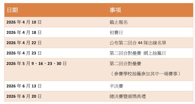 初賽各間學校出賽詳情將於2026年4月15日前電郵通知負責老師。