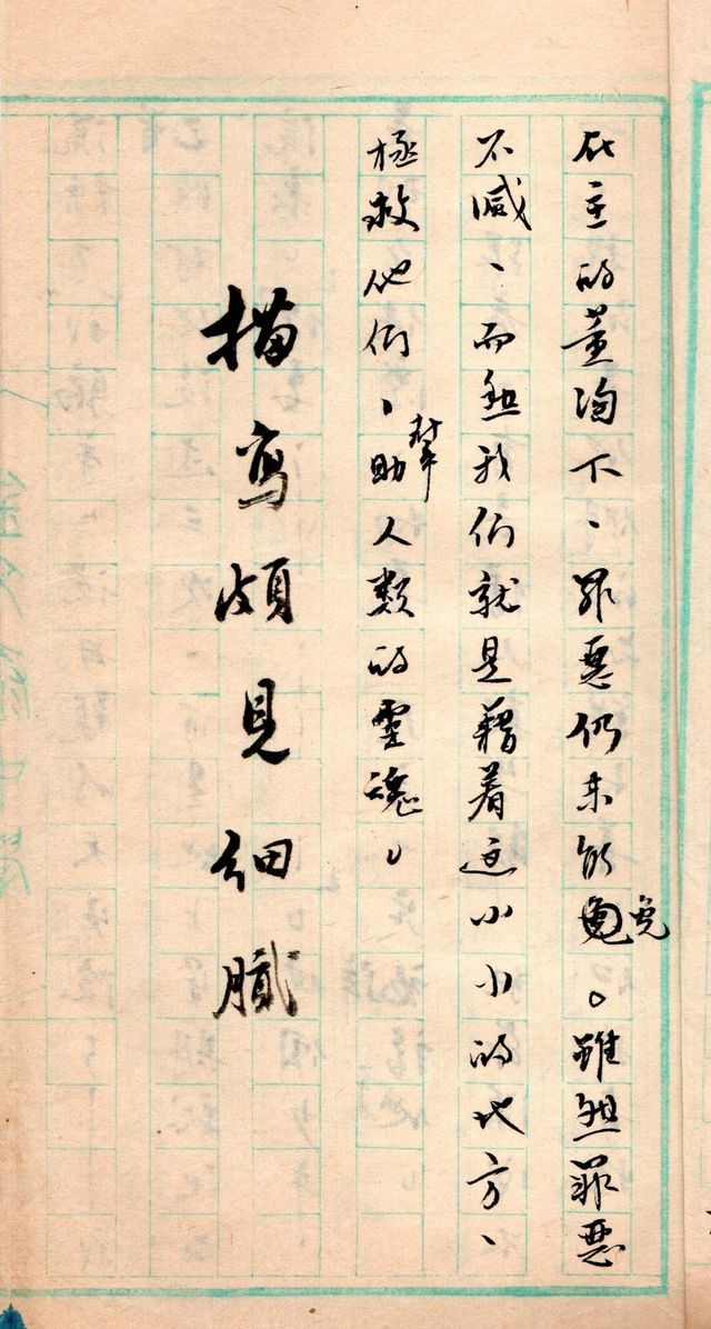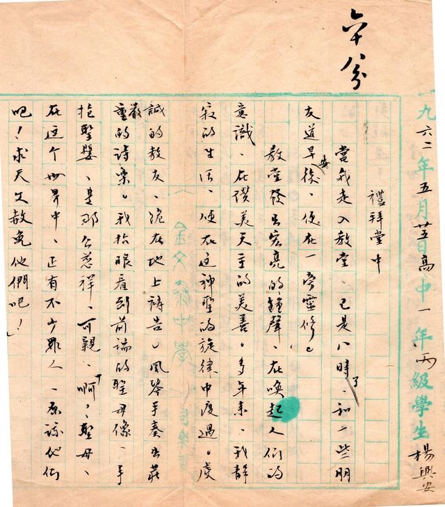 另一篇是高中一(中四)寫的作文。當日60年代,中學作文是用毛筆的,蘸墨寫在校方的綠色文格紙上,文格紙中央還印上校名,現在該屬古董了(見下圖)。當年劉偉之老師教作文。那天文題是「在廟宇中」,有同學說未嘗進過廟宇,可以改題目嗎?劉老師說,可以改作「禮拜堂中」。