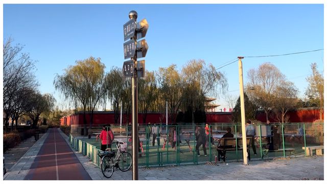 公園裏的日常生活依然按着自己的節奏進行。幾位老人穿着厚實的棉襖,在光影斑駁的林蔭間散步。幾張戶外乒乓球桌前居然圍滿了打球的鄰里,球拍擊中球面嗒嗒作響「啪嗒、啪嗒」,清脆而規律,在冷風裏聽來格外響亮。