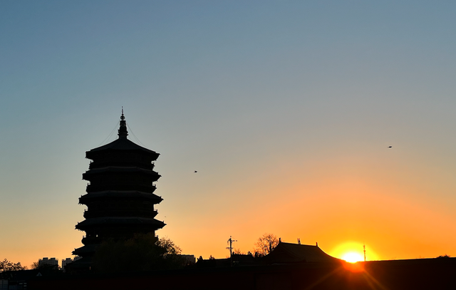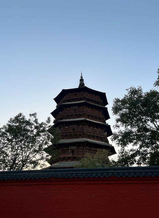 天色漸暗,木塔那層暗金色已經退去,只剩一抹黑色的輪廓。我在牆外一站就是個多小時,看着夕陽逐漸落盡,公園裏的老人早已收起球拍,風變得更冷洌。我知道,自己與這座塔之間,還欠一次真正的「相見」。臨走前,我回望木塔最後一眼,她在夜色中顯得愈發莊嚴肅穆。不知道,一千年以後,當我們早已化為塵土,這座塔,會否依然靜立?