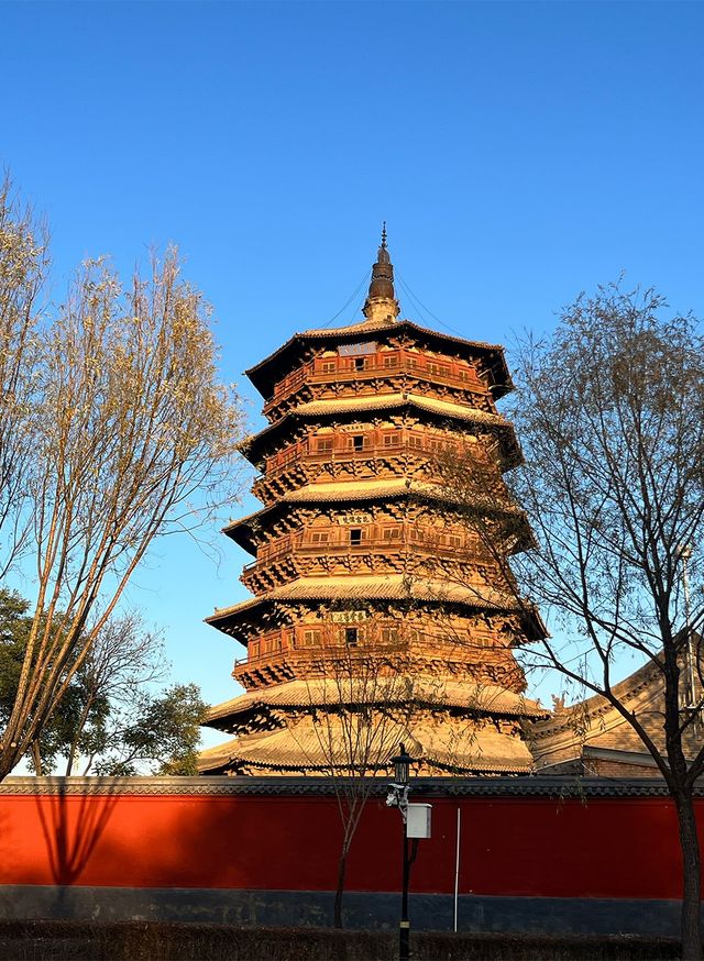 我抵達應縣時,已是日暮時分,塔影橫斜。冬日的陽光照着塔身,整個世界被罩進一層暗金色裏。工作人員正準備關門,不再讓人入內。我只得在外圍繞行,沿着塔外那片小公園慢慢踱步。