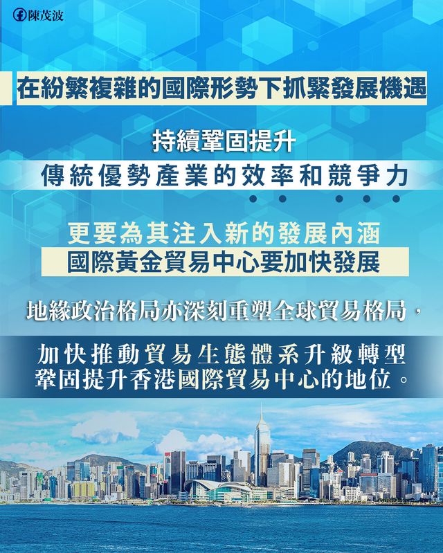 面對國際形勢風雲變幻,香港在一國兩制下超級聯繫人和超級增值人的角色和功能,特別是在急劇轉變的國際經貿環境中,更顯突出。在持續鞏固提升傳統優勢產業的效率和競爭力的同時,更要為其注入新的發展內涵,其中國際黃金貿易中心便是要加快發展的例子。