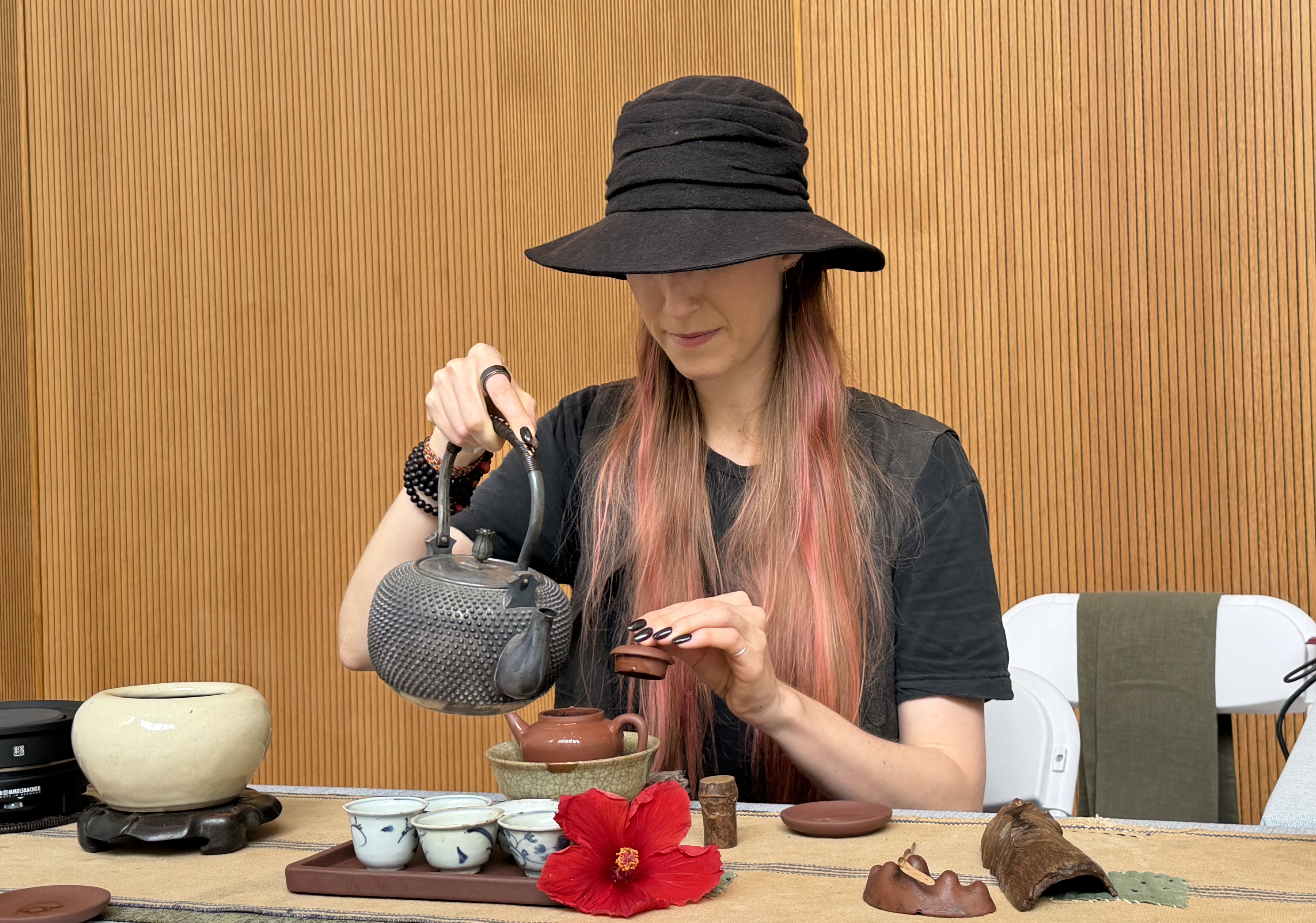 午飯後,匆匆返回大會現場。在一樓眾多茶席之間,備受注目的,是一位來自丹麥的金髮女席主Katrine Friis Olsen,自 2013年移居香港後,她即以「丹丘」之名研習多種茶道,以「茶為修行之道」為理念,曾於香港、台灣、溫哥華等地,師承多位老師習茶。目前,她在西貢家中經營一處茶空間,定期舉辦靜默茶會。席間,除了泡茶,她也分享喝茶帶來的健康感受。她沖泡的是普洱,茶湯紅濃,順滑甘甜而滋味醇厚。