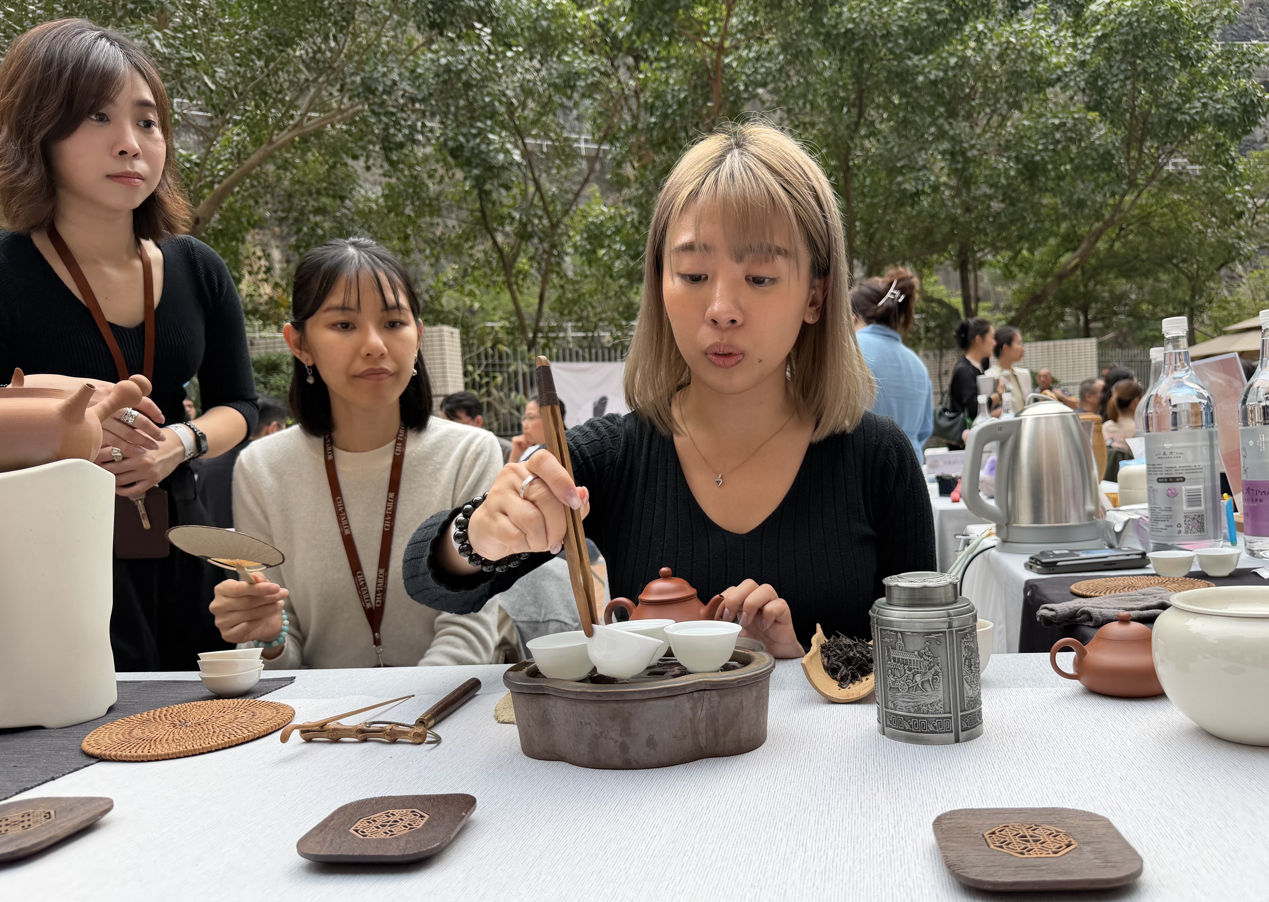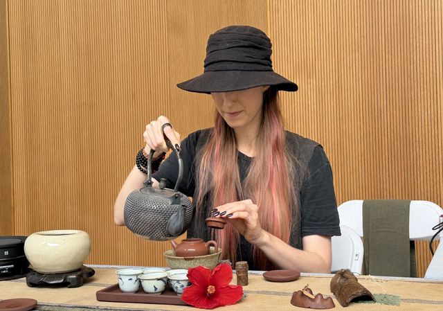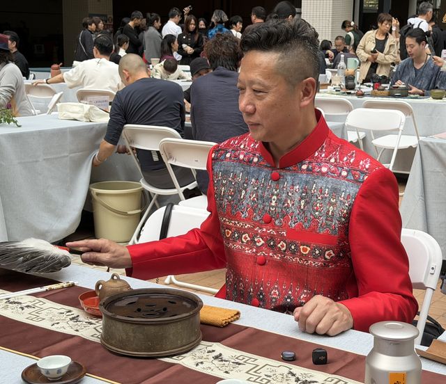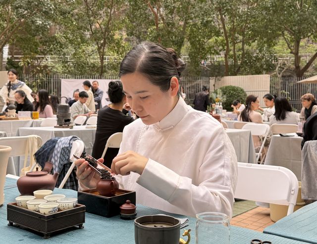 步出室外,不同的席主,來自不同地方,泡茶的技藝亦各有特色。例如香港的Cha-Tailor Tea Specialist聯合創辦人范曉菁,她在今年帶領其團隊以「澄懷觀道」為主題,榮獲香港國際茶展「茶席空間創意大賽」冠軍,體現對茶道美學的深入追求。席主指「Cha是茶,Tailor是為你量身定制。」期望每個人都能找到屬於自己的味道,屬於自己的茶。她以「細味慢活,品嚐人生」為目標,沖泡的烏龍茶,茶湯醇厚,亦別具韻味。