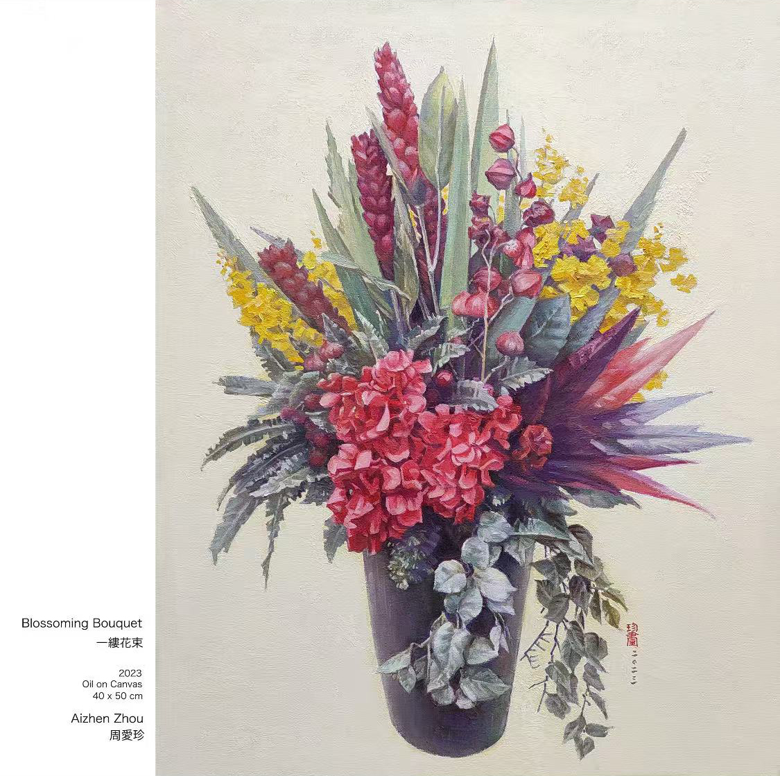 再欣賞周愛珍老師2023年的畫〈一縷花束〉(40x50cm),作為她的學生感知——這是一幅老師的心理寫照。畫面無十大名貴花卉,僅是平凡的縷縷小花,艶而不俗的花葉穿插,散發着親切的粲花含英,不張揚之灼灼其華,恰是秀色空絕世,絢麗默默跨時空。極為精細的筆觸,認真地塑造她的心聲,微妙而豐富的情絲。條理清晰有形可循,能隨手觸摸這縷花束,非常具像的油畫草本花卉,展示她靜謐的美學思維。