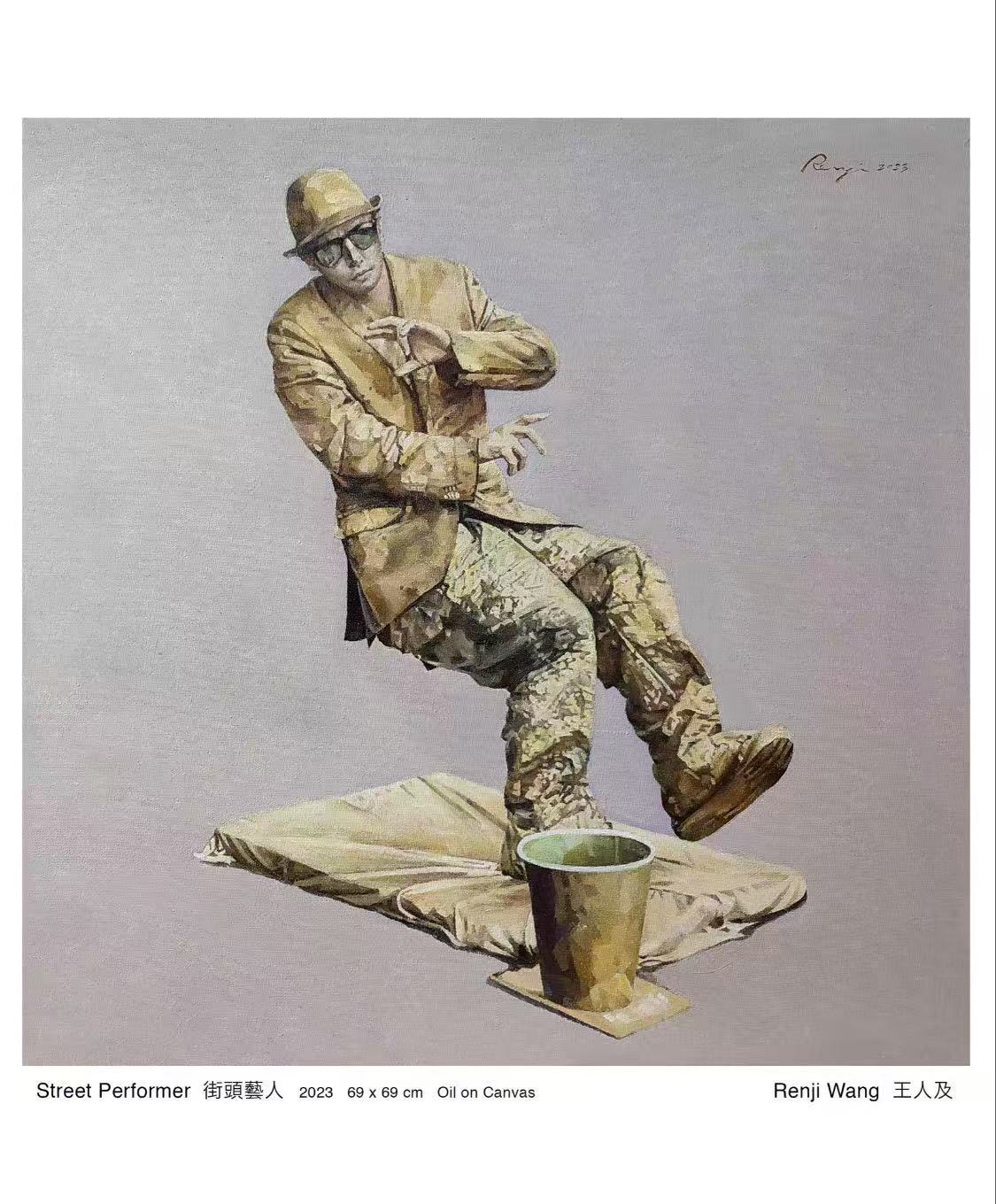 王人及老師69x69cm見方的畫面,省略了繁瑣的背景,以灰色調的氛圍,突出人物的主題。常言道:「金錢不是萬能,無錢萬萬不能。」地球人類都深諳其道。請看!表演者的帽和上裝、牛仔褲、鞋子、地下的墊子、紙筒,甚至臉部和手都塗上金色,所以被人稱作「金人」。那位金人舞姿跌宕起伏,瞬間展示出高難度的動態,透過其墨鏡洞察靈魂之窗,感受他表演時的全神貫注,舉手投足掌控着肢體的平衡。