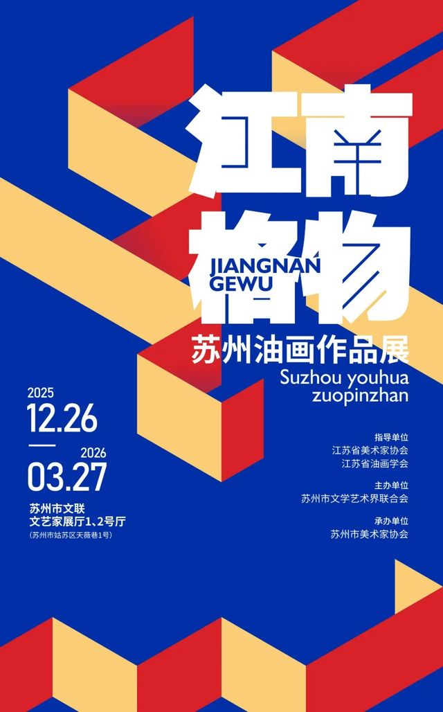 由江蘇省美術家協會、江蘇省油畫會指導,蘇州市文學藝術界聯合會主辦、蘇州美術家協會承辦的「江南格物──蘇州油畫作品展」在蘇州市文聯文藝家展廳,2025年12月26日拉開序幕,薈萃75件油畫精品,以多元筆觸全方位詮釋「格物」的深刻內涵,展期至2026年3月27日。