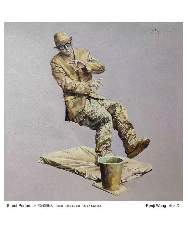〈街頭藝人〉是王人及老師2023年的作品,他的油畫佳作在悉尼畫廊素來極受歡迎。言歸正傳,街頭藝人在國外的城市較為流行,不論在廣場、車站、街頭等公眾地方,他們以舞蹈、特技、雜耍、魔術、默劇、音樂、繪畫等方式展現自我,同時賺取小費,似城市中的活雕塑。現代都市除了具規模的藝術館,亦給予藝人在室外與眾共享的自由,讓平民各取所需,尋求生活情趣。往往不少高手來自人間。