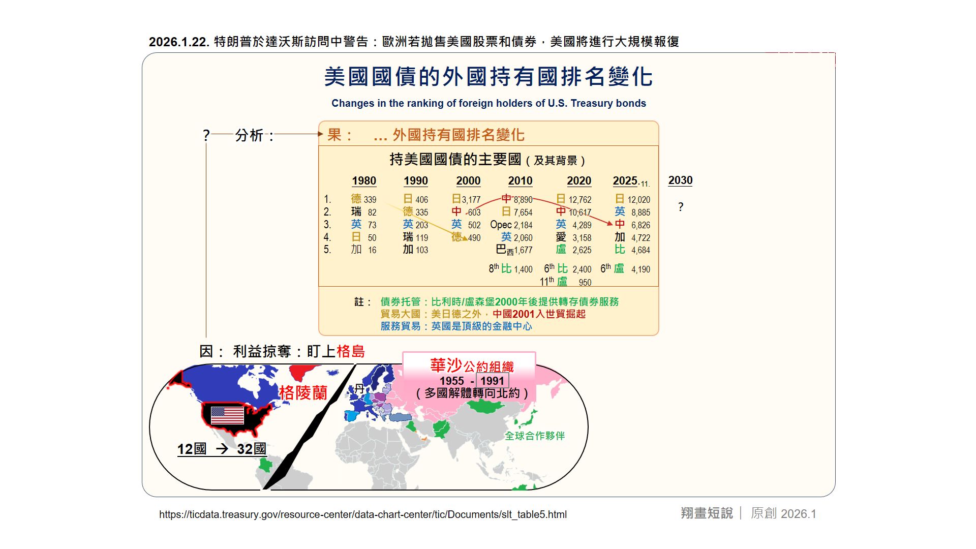 1月下旬,達沃斯論壇期間特朗普再拋驚言,繼續放話要奪取格陵蘭,警告歐洲「拋售美元資產者將遭報復」。巧合的是,美債已現沽壓,引發的小型崩盤。這一切環環相扣,特朗普發起的不止是貿易戰,更間接推動了一場災難性的金融戰,面對手握超過3.6萬億美元美債的歐洲,其影響或將徹底動搖二戰後的既有國際秩序。