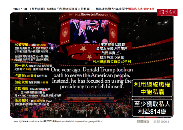 根據《紐約時報》1月20日披露,特朗普就職一年來,已利用總統職權中飽私囊,通過冠名授權、加密貨幣等渠道攫取至少14億美元私人利益。這種「為政不仁、以權謀私」的執政邏輯,任意妄為將國家利益推向金融戰漩渦,摧毀二戰後由美國主導的國際秩序支柱。美國向外舉債遇困,缺乏資金支持國家運作,作為執掌這個250年歷史的任性總統,或將美國推向一場懸崖邊的非硝煙大戰。