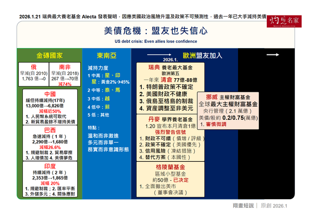美國國債長期以來的「無風險資產」(Risk-Free Asset)標籤,早已被質疑。瑞典最大養老基金一年內減持70多億美債,丹麥學界養老基金閃電清倉1億美元,就連區域小型的格陵蘭基金,也正式決定撤出美國市場。星星之火正在燎原,它們的理由高度一致,總統政策反覆無常、財政不健康,美債不再安全,反擊防衛戰被迫下已悄然啟動!