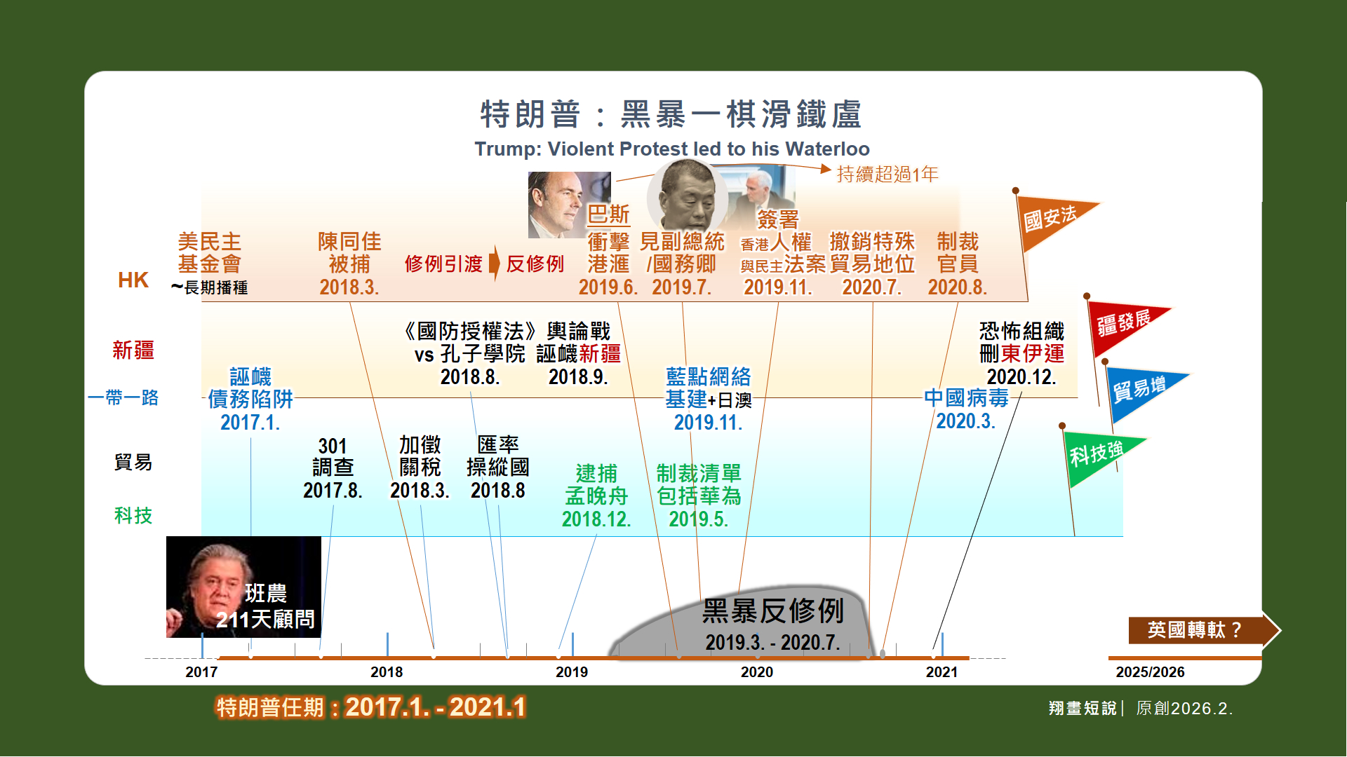 事件要回到2019年,英國跟着美國對香港說三道四。香港動亂的黑手,是《蘋果日報》黎智英,背後則有當年美國總統特朗普撐腰。重溫特朗普對華政策便清晰可知,其妄圖從經貿、科技、新疆多領域破壞,最終動用香港作棋子對付中國,結果一一潰敗,淪為特朗普的滑鐵盧。